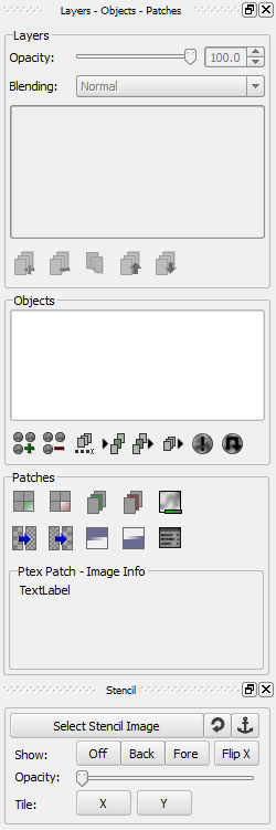 The Painting Panel is where the painting project is set up. This panel has two dockable windows, the Objects-Layers-Patches window and the Stencil window.